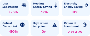 During the heating season, the same predictivelogic ensures precise radiator control, stable indoor temperatures, and efficientheating use. Adaptive control reduces energy use during unoccupied hours andautomatically preheats classrooms before pupils arrive in the morning and lowers heat during unoccupied hours.
